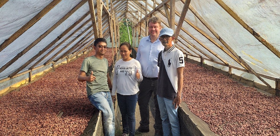 In der philippinischen Region Monkayo (Provinz Compostela Valley auf der Insel Mindanao) besuchte SanoVita Kakaofarmer, die für die deutsche Stiftung Mama Earth (www.mama-earth.de) Kakao anbauen. Das obige Foto zeigt die Verantwortlichen unseres dortigen Vertriebspartners, STEFES Indonesia, sowie von Mama Earth mit unserem COO Martin Nesensohn bei der Trocknung von Kakaobohnen. Mama Earth ist sehr an dem Einsatz von SanoVitas Herbagreen® Produkten interessiert, um Ertrag und Qualität der Kakaobohnen zu erhöhen.