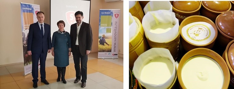 Seit 1870 produzieren die Bauern der Region Wologda, nach Jahrhunderte alter französi¬scher Rezepturen einen der Exportschlager Russlands - "Wologdaer Butter“, ein in seinen Geschmackseigenschaften und Qualität einzigartiges Produkt. Unser Partner in der Region, die Fa. RusAgroPartner hat die 7 größten Milchproduzenten der Region zu einem Treffen mit SanoVita eingeladen. Das Interesse der Landwirte liegt in der Steigerung der Milchproduktion und der Qualität der Milchprodukte durch den Einsatz von Herba-green® und Animamineral®-Produkten. Wäh-rend des Meetings wurden die Testanwendun-gen von Herbagreen® und Animamineral® in den Betrieben während der Sommersaison 2019 vereinbart. Auf dem Bild: Mitarbeiter der Firma RusAgroPartner: CEO Herr A. Lopatin, Lei¬ter der Filiale in Gryazovets Frau E. Avdue¬vskaya und COO Eastern Europe der Firma SanoVita, Herr Dr. A. Lebedev.